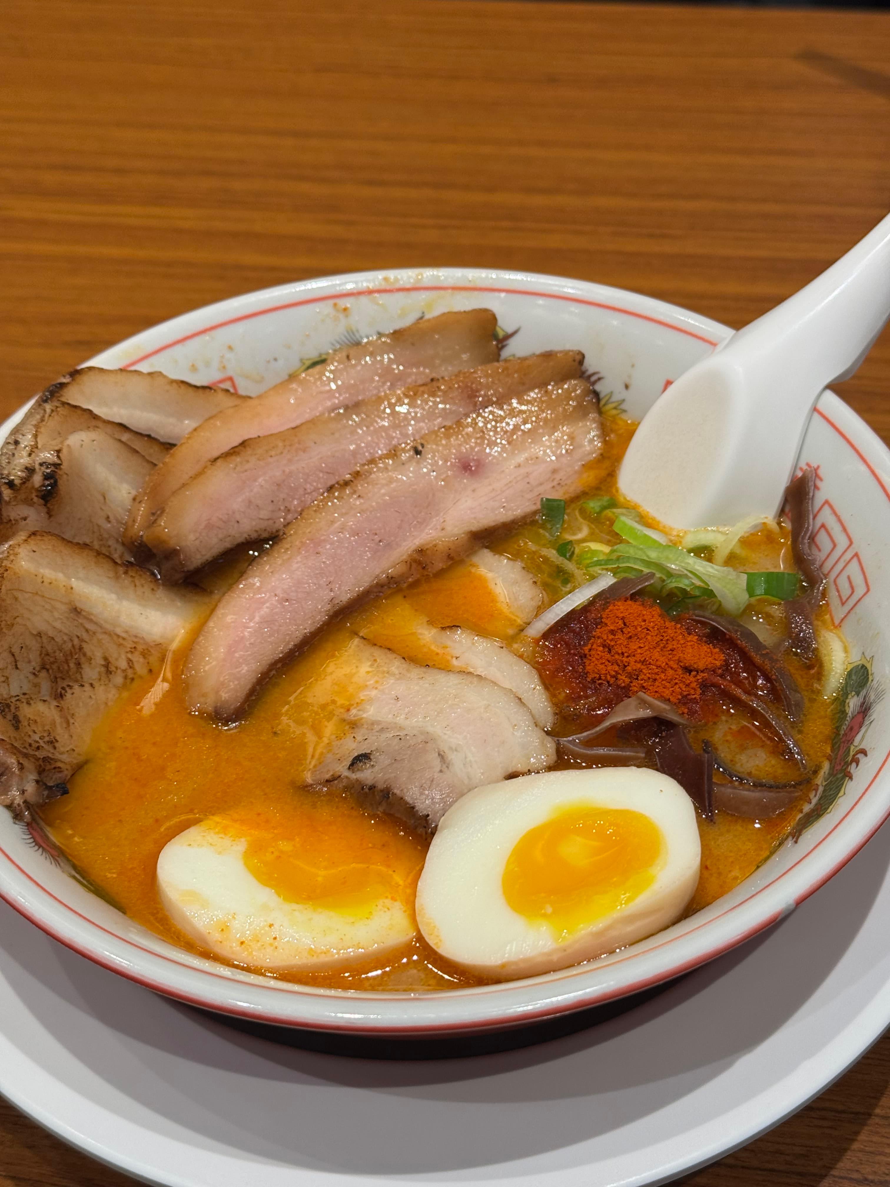 일본식 곱창 라멘. 얼큰한 국물과 탱글탱글한 곱창이 중독성 강함.