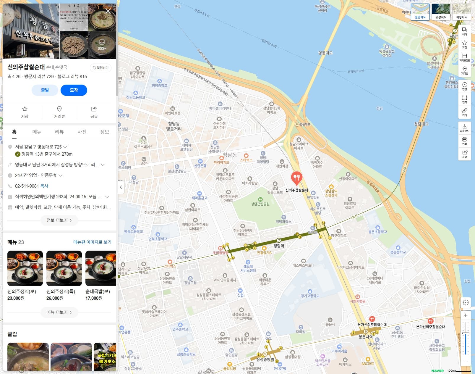 24시간 순댓국을 자랑하는 맛집, 신의주찹쌀순대 청담본점이 있습니다.이곳은 ‘나혼자산다’, ‘백반기행’에도 소개될 만큼 유명한 곳으로