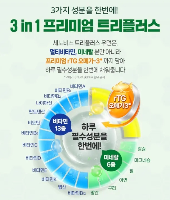 항목세노비스 트리플러스뉴트리라이트 더블엑스얼라이브 원스데일리성분 수 17종 21종 20종 오메가3 포함 없음 없음 복용법 1일 2정 3회 2정 1일 1정 가격 약 2만원대 6~8만원대 2만5천원 내외 특장점 밸런스+가격+오메가 고함량 프리미엄 가성비 좋음 👉 세노비스는 ‘가성비와 구성의 밸런스’가 뛰어난 선택입니다.