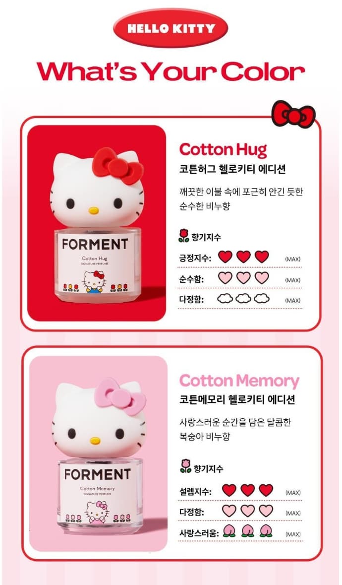 향기명탑 노트미들 노트베이스 노트코튼 366 시트러스, 블루밍 플로럴 로즈, 아이리스 화이트 머스크, 앰버 코튼 메모리 피치, 프리지아 플로럴 파우더리 머스크 👉 두 향 모두 헬로키티의 사랑스러운 무드와 잘 어울리는 베스트 셀링 퍼퓸이에요.