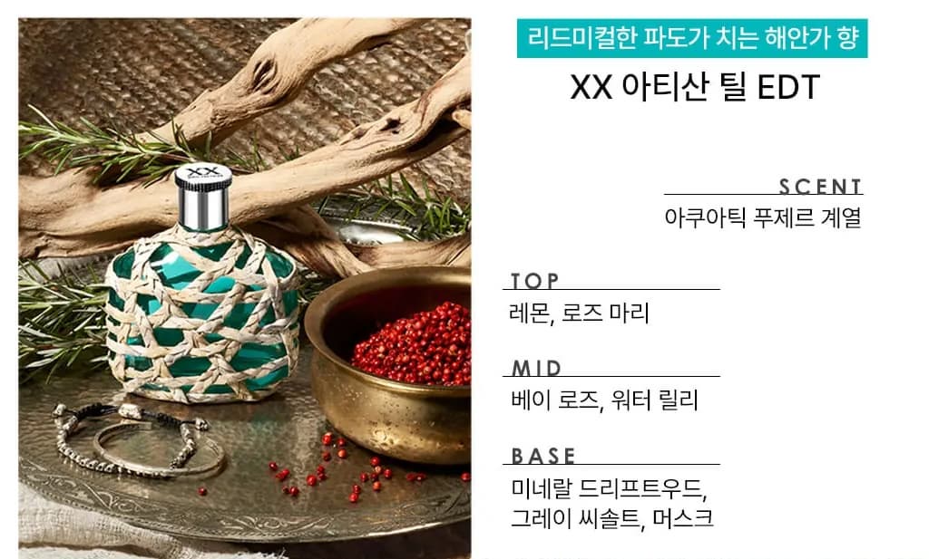 노트 단계향기 구성탑 노트 시트러스, 베르가못, 로즈마리 미들 노트 제라늄, 아이리스, 샐비어 베이스 노트 시더우드, 머스크, 베티버 💡 전체적으로 향이 매우 깨끗하고 부드러우며,