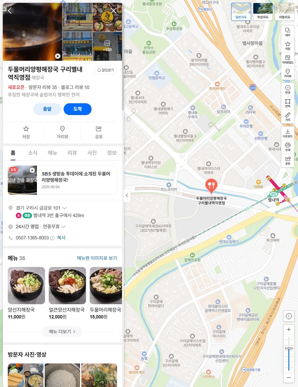 👉 두물머리양평해장국 구리별내역직영점 지도 보기 (네이버)